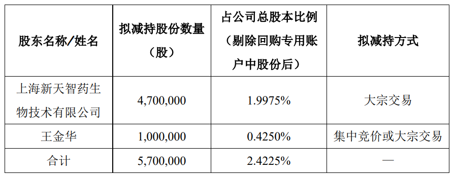 持有公司股份77,763,666股(占剔除公司回购专用账户中股份后总股本的33.0490%)的控股股东新天智药计划以大宗交易方式减持其持有的公司股份不超过4,700,000股(占其持有公司股份总数的6.0440%,占剔除公司回购专用账户中股份后总股本的1.9975%)。