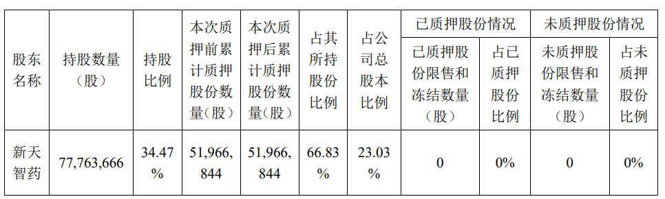 新天药业2024年11月1日披露关于控股股东部分股份质押展期的公告显示,截至公告日,控股股东新天智药累计质押股份51,966,844股,占其所持股份比例为66.83%,占公司总股本比例为23.03%。