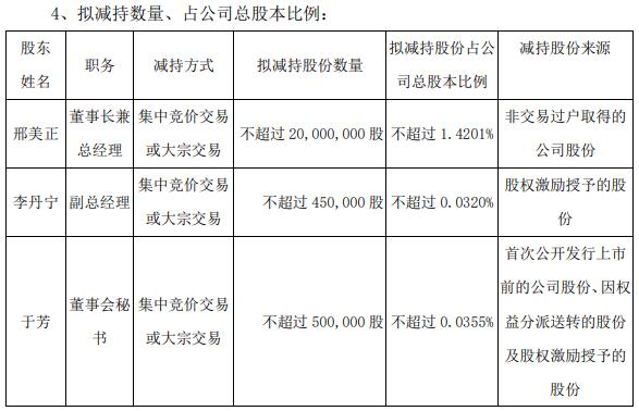 邢美正计划在公告披露之日起15个交易日后的3个月内(在此期间如遇法律法规规定的窗口期则不减持)以大宗交易或集中竞价方式,共减持公司股份不超过20,000,000股,占公司总股本的比例为1.4201%。