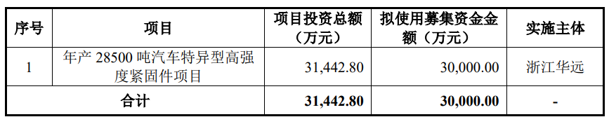 浙江华远本次发行募集资金总额为31,386.71万元,扣除发行费用后的实际募集资金净额为26,269.81万元,公司募集资金净额比原计划少3,730.19万元。浙江华远2025年3月20日披露的招股书显示,公司拟募集资金30,000.00万元,用于年产28500吨汽车特异型高强度紧固件项目。