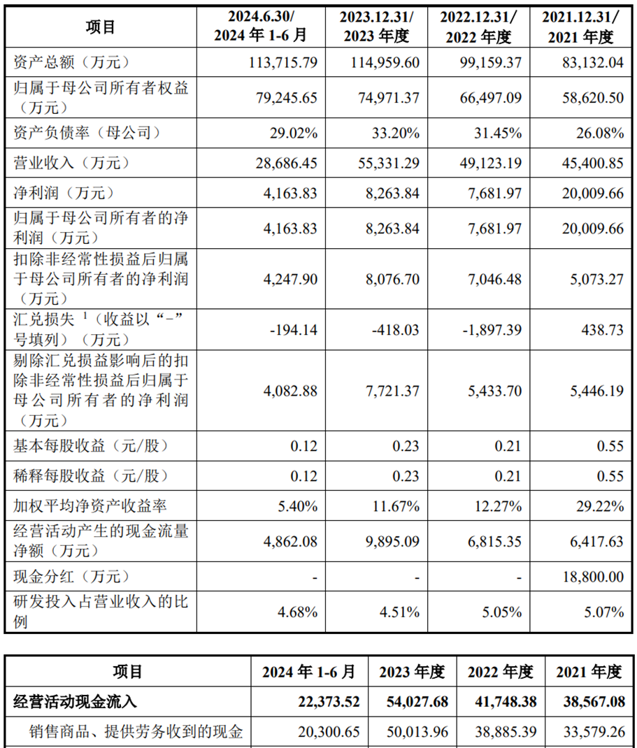 2021年至2024年1-6月,浙江华远的营业收入分别为45,400.85万元、49,123.19万元、55,331.29万元和28,686.45万元;净利润/归属于母公司所有者的净利润分别为20,009.66万元、7,681.97万元、8,263.84万元和4,163.83万元;扣除非经常性损益后归属于母公司股东净利润分别为5,073.27万元、7,046.48万元、8,076.70万元和4,247.90万元。