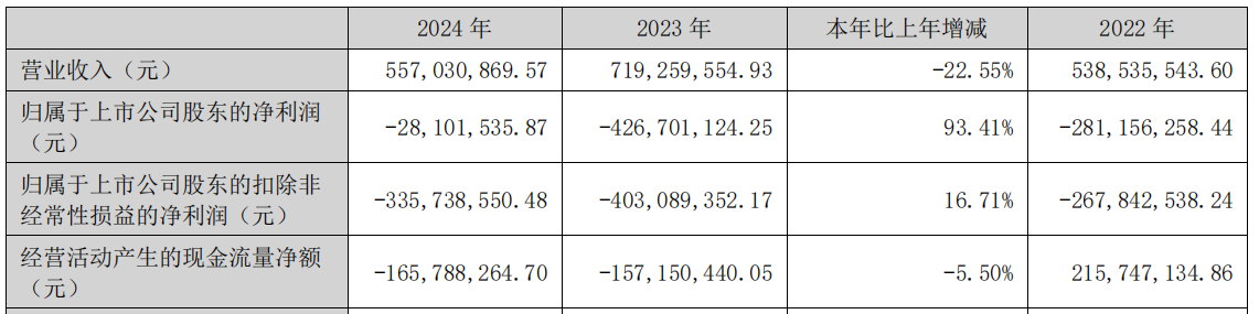 云南旅游2024年年度报告显示,2024年,公司实现营业收入5.57亿元,同比下降22.55%;归母净利润为-2810.15万元,上年同期为-4.27亿元;扣非净利润为-3.36亿元,上年同期为-4.03亿元;经营活动产生的现金流量净额为-1.66亿元,上年同期为-1.57亿元。