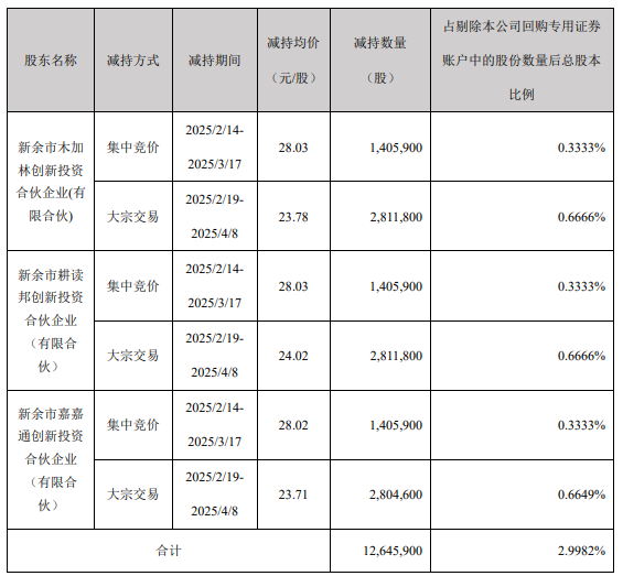 木加林、耕读邦、嘉嘉通合计减持1264.59万股,减持股份占比为2.9982%。经中国经济网记者计算,依照减持均价,木加林、耕读邦、嘉嘉通合计减持金额约为31910.92万元。