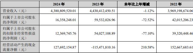 中国经济网北京4月11日讯 药易购(300937.SZ)昨晚披露2024年年报。2024年,公司实现营业收入43.81亿元,同比减少1.12%;归属于上市公司股东的净利润1635.82万元,同比减少72.52%;扣除非经常性损益后的净利润1236.97万元,同比减少77.10%;经营活动产生的现金流量净额1.28亿元,同比增长210.58%。