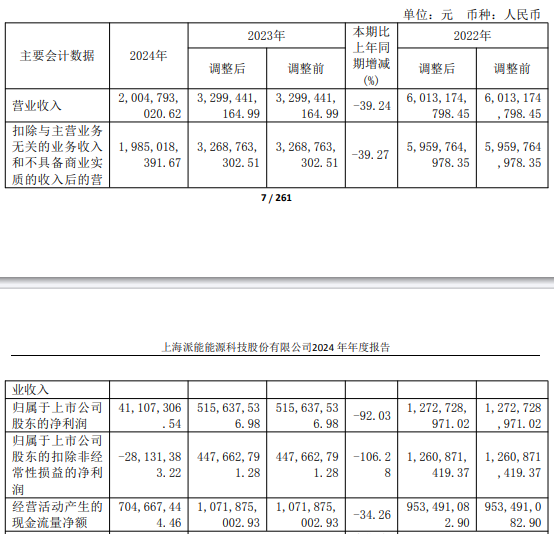 中国经济网北京4月14日讯 派能科技(688063.SH)4月12日发布2024年年度报告。2024年,公司实现营业收入20.05亿元,同比下降39.24%;归属于上市公司股东的净利润4110.73万元,同比下降92.03%;归属于上市公司股东的扣除非经常性损益的净利润-2813.14万元,上年同期4.48亿元;经营活动产生的现金流量净额为7.05亿元,同比下降34.26%。