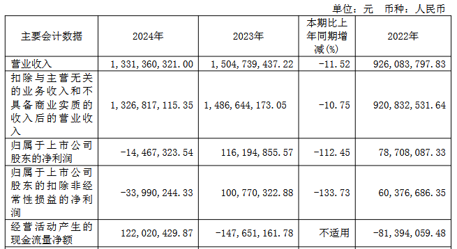 2024年,公司实现营业收入13.31亿元,同比下降11.52%;归属于上市公司股东的净利润为-1,446.73万元,上年同期为11,619.49万元;归属于上市公司股东的扣除非经常性损益的净利润为-3,399.02万元,上年同期为10,077.03万元;经营活动产生的现金流量净额为12,202.04万元。