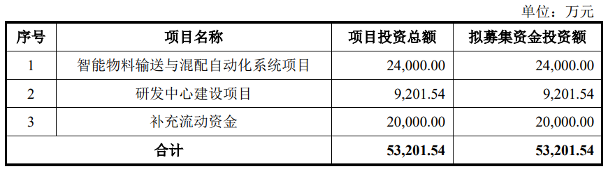 宏工科技本次发行募集资金总额53,200.00万元,扣除发行费用后的募集资金净额为47,425.23万元,公司最终募集资金净额比原计划少5,776.31万元。宏工科技2025年4月14日披露的招股书显示,公司拟募集资金53,201.54万元,用于智能物料输送与混配自动化系统项目、研发中心建设项目、补充流动资金。