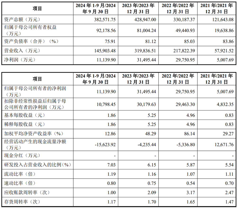 2021年至2024年1-9月,宏工科技的营业收入分别为57,921.52万元、217,822.39万元、319,836.51万元和145,903.48万元;净利润/归属于母公司所有者的净利润分别为5,007.69万元、29,750.95万元、31,495.44万元和11,139.90万元;扣除非经常性损益后归属于母公司股东的净利润分别为4,832.35万元、29,463.30万元、30,179.63万元和10,798.45万元。