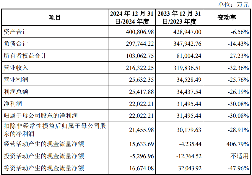 2024年,宏工科技实现营业收入216,322.25万元,较去年同期减少32.36%;净利润/归属于母公司股东的净利润为22,022.21万元,较去年同期减少30.08%;扣除非经常性损益后归属于母公司所有者的净利润为21,455.98万元,较去年同期减少28.91%;经营活动产生的现金流量净额为15,633.69万元。