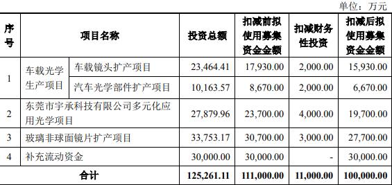 本次向特定对象发行A股股票募集资金总额不超过人民币100,000.00万元(含,已扣除财务性投资影响),扣除发行费用后的募集资金净额拟投入车载光学生产项目(含车载镜头扩产项目、汽车光学部件扩产项目、东莞市宇承科技有限公司多元化应用光学项目、玻璃非球面镜片扩产项目、补充流动资金。