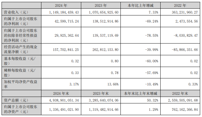 中国经济网北京418日讯 惠城环保(300779.SZ)昨日晚间披露2024年年度报告。2024年公司实现营业收入11.49亿元,同比增长7.33%;归属于上市公司股东的净利润4259.97万元,同比下降69.24%归属于上市公司股东的扣除非经常性损益的净利润2992.54万元,同比下降78.55%;经营活动产生的现金流量净额1.58亿元,同比下降39.99%