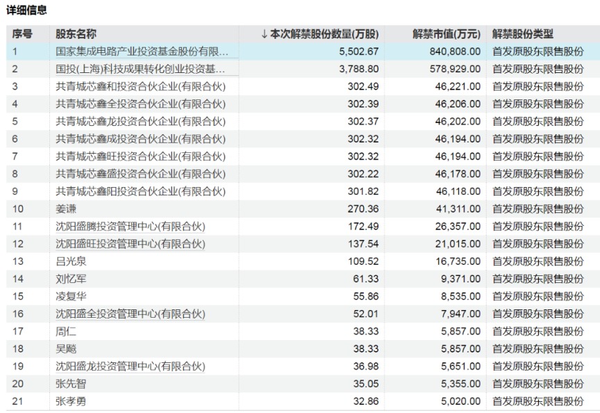 在下周面临解禁的33只股票中,解禁市值最大的拓荆科技解禁股东为国家集成电路产业投资基金股份有限公司、国投(上海)科技成果转化创业投资基金企业(有限合伙)、共青城芯鑫和投资合伙企业(有限合伙)等21个股东。其中,国家集成电路产业投资基金股份有限公司为拓荆科技第一大股东。