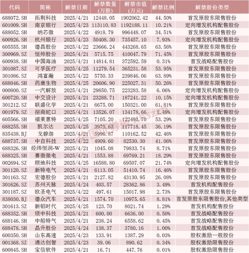 具体来看,Wind数据显示,拓荆科技4月21日将解禁1.24亿股,均为首发原股东限售股份。南京银行4月23日将解禁11.31亿股,均为定向增发机构配售股份。纳芯微4月22日将解禁4918.79万股,均为首发原股东限售股份。