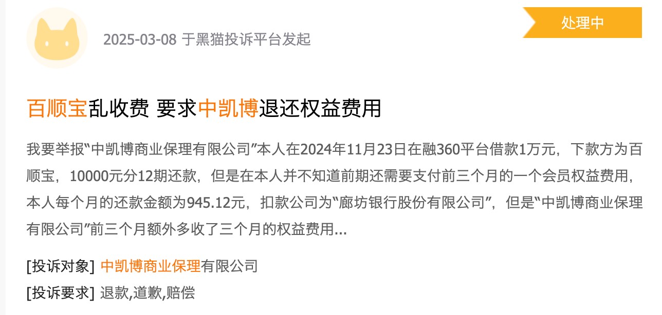 记者在黑猫投诉平台检索发现,近期关于助贷平台“百顺宝”的投诉量激增,过去30天内关于该平台的投诉达到777条,总投诉量达10698条。消费者主要反映的问题包括收取权益费、会员费、商品分期费等隐形费用,贷款利率达36%等。