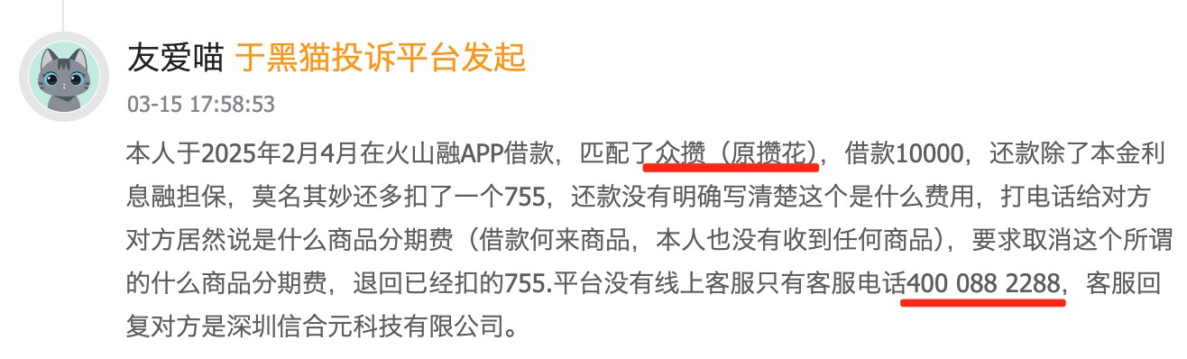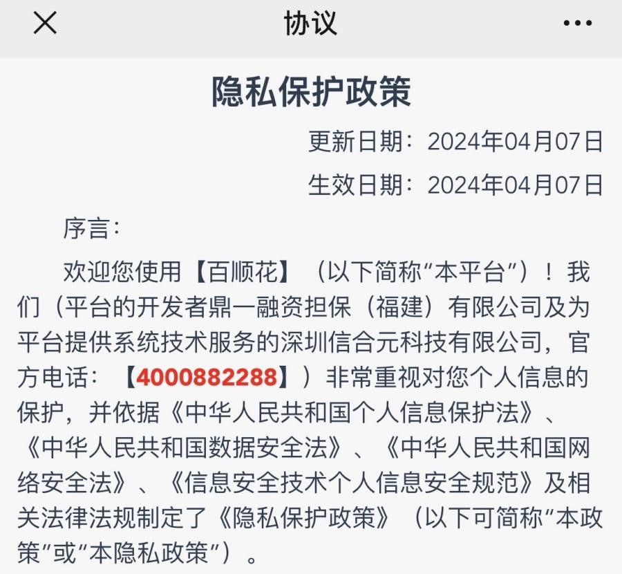 据梳理,尽管产品名称不同,“百顺花”“攒花”“众攒”等均与信合元科技有关联。例如,“百顺花”显示运营机构为鼎一融资担保(福建)有限公司。而“百顺花”微信小程序《隐私保护政策》披露,该平台由信合元科技提供系统技术服务。另一名消费者披露的信息显示,第三方平台提供的“攒花”客服电话为400 088 2288,这与“百顺花”的官方电话相同。