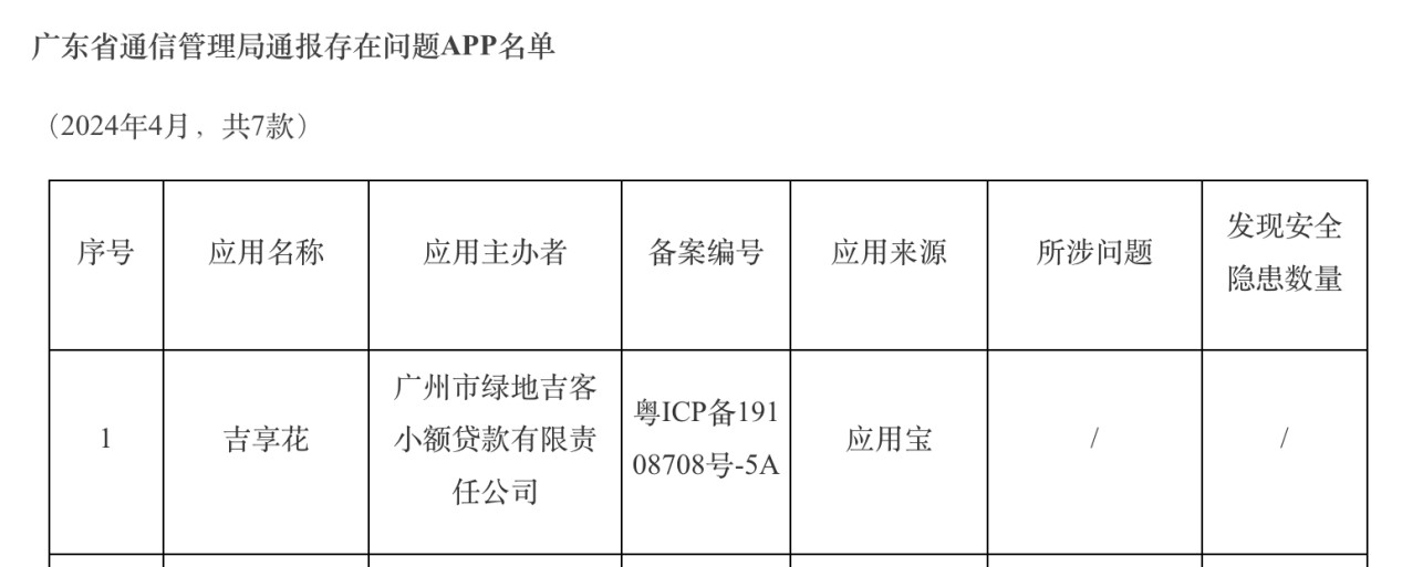 记者关注到,“百顺宝”“吉享花”两款应用均曾因App违规被通报。2024 年4月30日,广东省通信管理局公开通报7款未按要求完成整改的APP,来自应用宝的“吉享花”APP在列。通报要求,被通报的APP应在5月10日前完成整改及反馈工作。逾期不整改的,将依法依规采取下一步处置措施,切实维护APP用户合法权益和网络安全秩序。