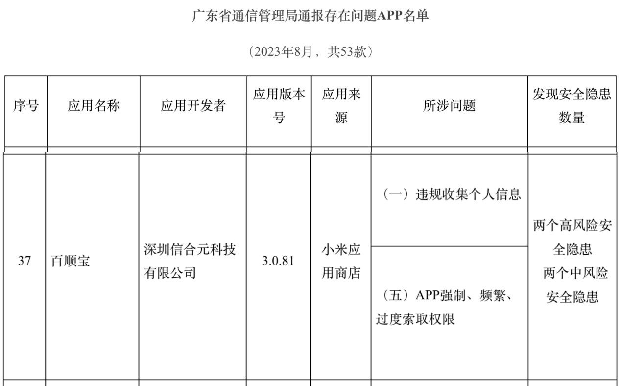 此前2023年8月,广东省通信管理局通报显示,小米应用商店的3.0.81版本“百顺宝”APP存在违规收集个人信息、APP强制、频繁、过度索取权限等问题,且未按要求完成整改。广东省通信管理局要求其限期整改。