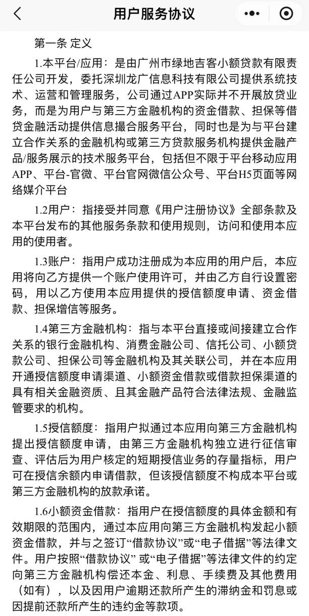 《用户服务协议》显示,公司通过APP实际并不开展放贷业务,而是为用户与第三方金融机构的资金借款、担保等借贷金融活动提供信息撮合服务平台,同时也是为与平台建立合作关系的金融机构或第三方贷款服务机构提供金融产品/服务展示的技术服务平台。