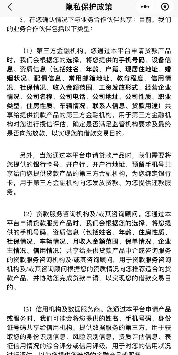 《隐私保护政策》还显示,当用户通过“吉享花”申请贷款产品时,平台除了将用户提供的银行卡号、开户行、开户行地址、预留手机号共享给第三方金融机构外,还会将用户提供的手机号码、资质信息(包括姓名、年龄、住房性质、社保情况、车辆情况、月收入金额范围、保单情况、企业主情况、信用情况)共享给提供贷款产品中介或咨询服务的贷款服务咨询机构及/或其咨询顾问,用以推荐适合的贷款产品。