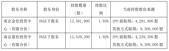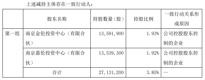 公告称,本次减持股份计划实施前,多伦科技股东南京金伦投资中心(有限合伙)(以下简称“金伦投资”)、南京嘉伦投资中心(有限合伙)(以下简称“嘉伦投资”)分别持有公司股份13,591,900股、13,539,300股,分别占公司总股本的1.93%、1.92%。金伦投资和嘉伦投资均为公司控股股东南京多伦企业管理有限公司的一致行动人。