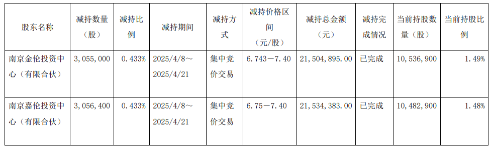 金伦投资、嘉伦投资以集中竞价交易方式减持其持有的公司股份分别不超过3,055,000股(含)、3,056,400股(含)。公司于2025年4月21日收到金伦投资、嘉伦投资送达的《减持公司股份结果告知函》,金伦投资、嘉伦投资于2025年4月8日至4月21日期间通过集中竞价交易分别累计减持公司股份3,055,000股、3,056,400股。截至公告日,金伦投资、嘉伦投资减持计划已实施完毕。