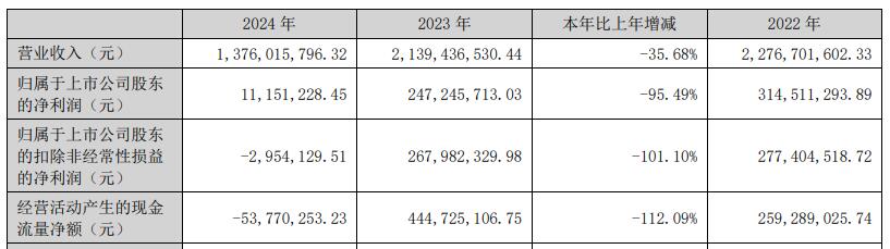 中国经济网北京4月23日讯 火星人(300894.SZ)昨晚发布的2024年年度报告显示, 2024年,公司实现营业收入13.76亿元,同比下降35.68%;归属于上市公司股东的净利润1115.12万元,同比下降95.49%;归属于上市公司股东的扣除非经常性损益的净利润-295.41万元,上年同期为2.68亿元;经营活动产生的现金流量净额-5377.03万元,上年同期为4.45亿元。