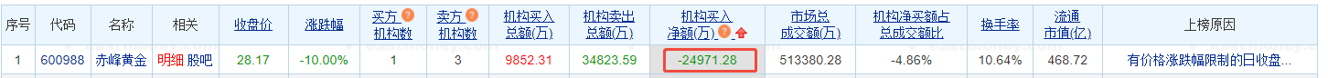 赤峰黄金A股跌停 机构净卖出2.5亿元