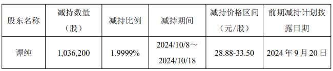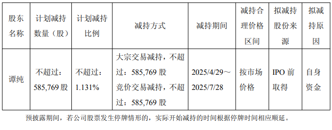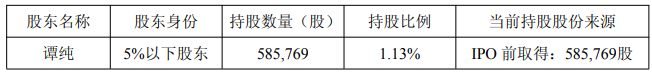 截至公告披露日,谭纯直接持有公司股票585,769股,占公司总股本的1.13%。上述股份为公司首次公开发行前取得的股份,其中直接持有股份已于2022年3月14日解除限售上市流通。