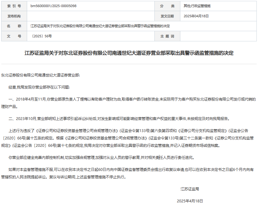 上述行为违反了《证券公司和证券投资基金管理公司合规管理办法》(证监会令第133号)第六条第四项和《证券公司分支机构监管规定》(证监会公告〔2020〕66号)第十五条的规定。根据《证券公司和证券投资基金管理公司合规管理办法》(证监会令第133号)第三十二条第一款和《证券公司分支机构监管规定》(证监会公告〔2020〕66号)第十七条的规定,江苏证监局决定对东北证券南通世纪大道证券营业部采取出具警示函的行政监管措施,并记入证券期货市场诚信档案。