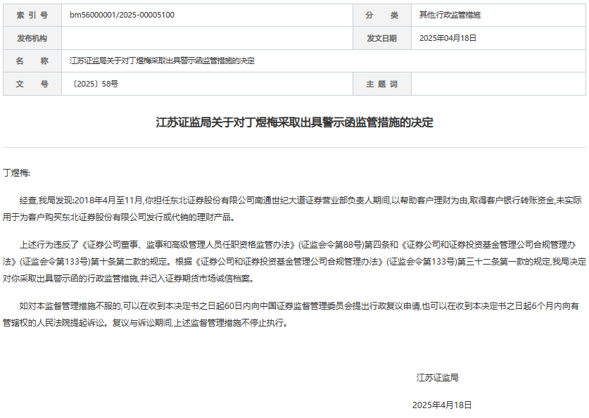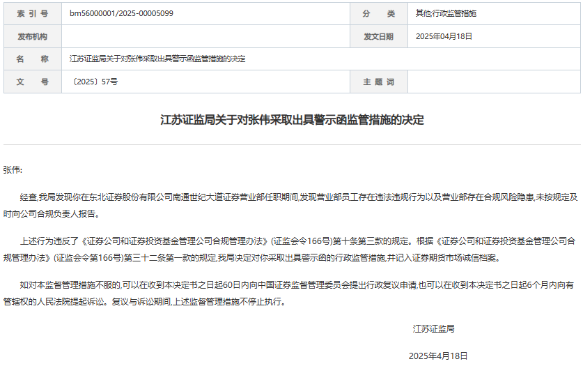 中国经济网北京4月24日讯 江苏证监局网站近日披露了事涉东北证券股份有限公司(以下简称“东北证券”,000686.SZ)的3份警示函:《江苏证监局关于对东北证券股份有限公司南通世纪大道证券营业部采取出具警示函监管措施的决定》、《江苏证监局关于对丁煜梅采取出具警示函监管措施的决定》、《江苏证监局关于对张伟采取出具警示函监管措施的决定》。