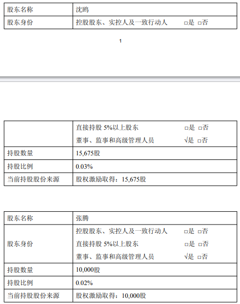 截至公告披露日,公司副经理沈鸥和董事会秘书张腾分别持有公司股份15,675股、10,000股,分别占公司总股本的0.03%、0.02%。上述股份来源均为股权激励取得的股份,已于2023年6月29日上市流通。