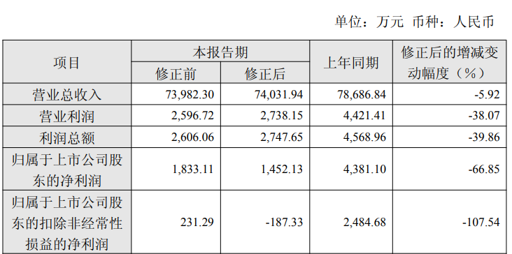 中国经济网北京4月24日 皖仪科技(688600.SH)昨晚披露2024年度业绩快报更正公告。修正后营业总收入为74,031.94万元,同比下降5.92%;修正后归属于上市公司股东的净利润为1,452.13万元,同比下降66.85%;修正后归属于上市公司股东的扣除非经常性损益的净利润为-187.33万元,上年同期为2484.68万元。