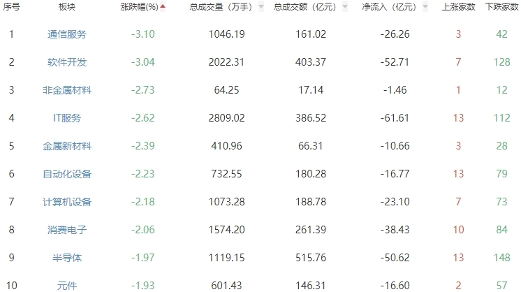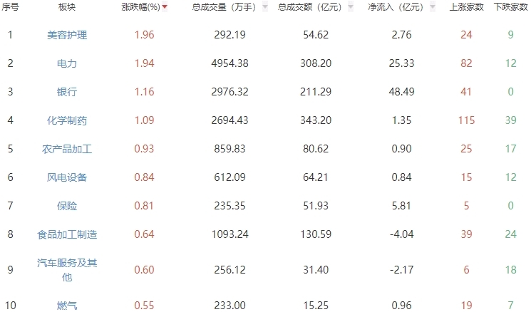 板块方面,美容护理、电力、银行等板块涨幅居前,通信服务、软件开发、非金属材料等板块跌幅居前。
