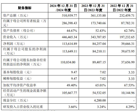 2022年、2023年、2024年,天有为营业收入分别为197,232.65万元、343,707.85万元、446,465.34万元;净利润分别为39,666.31万元、84,257.04万元、113,614.89万元;归属于母公司股东的净利润分别为39,673.95万元、84,210.11万元、113,649.11万元;归属于母公司股东扣除非经常性损益后的净利润分别为37,656.99万元、89,407.15万元、110,834.00万元。