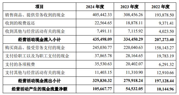 2022年、2023年、2024年,天有为经营活动产生的现金流量净额分别为10,144.96万元、54,532.05万元、105,667.77万元;销售商品、提供劳务收到的现金分别为193,878.50万元、308,456.26万元、405,442.33万元。