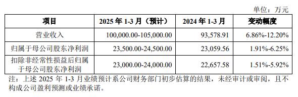 天有为预计2025年1-3月营业收入100,000.00万元至105,000.00万元,同比增长6.86%至12.20%;归属于母公司股东净利润23,500.00万元至24,500.00万元,同比增长1.91%至6.25%,扣除非经常性损益后归属于母公司股东净利润23,000.00万元至24,000.00万元,同比增长1.51%至5.92%。