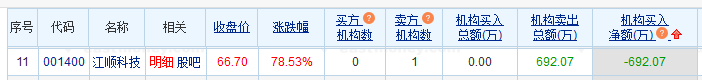 江顺科技龙虎榜:1家机构进卖出前5 净卖出692.07万元