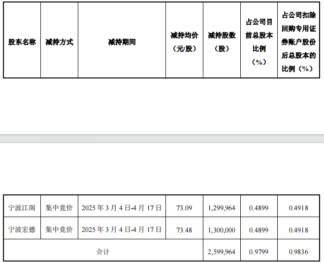 2025年3月4日至4月17日,宁波江阁以集中竞价方式减持公司股份1,299,964股,占公司目前总股本比例0.4899%,减持均价为73.09元/股;宁波宏德以集中竞价方式减持公司股份1,300,000股,占公司目前总股本比例0.4899%,减持均价为73.48元/股。上述减持股份来源于公司首次公开发行股票前已发行的股份。据此计算,宁波江阁和宁波宏德合计减持260.00万股,套现19053.84万元。