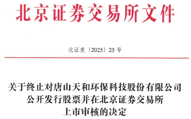 2024年8月22日,天和环保向北交所提交了《唐山天和环保科技股份有限公司关于撤回向不特定合格投资者公开发行股票并在北京证券交易所上市申请文件的申请报告》,申请撤回申请文件。根据《北京证券交易所向不特定合格投资者公开发行股票并上市审核规则》第五十五条的有关规定,北交所决定终止天和环保公开发行股票并在北京证券交易所上市的审核。