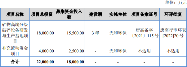 天和环保原拟募集资金18,000.00万元,分别用于矿物高端分级破碎设备研发与生产基地项目、补充流动资金项目。