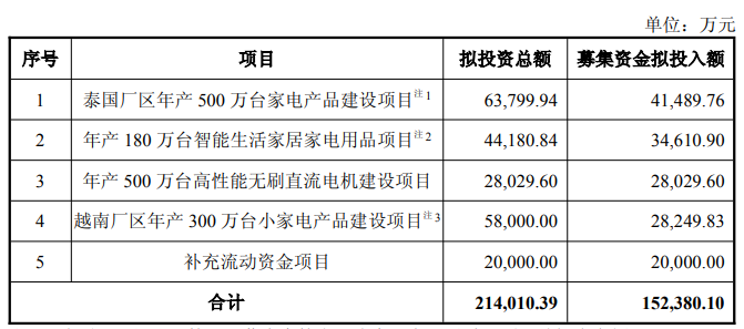 德昌股份2021年10月8日披露的招股书显示,公司拟募集资金14.87亿元,分别用于宁波德昌科技有限公司年产734万台小家电产品建设项目、德昌电机越南厂区年产380万台吸尘器产品建设项目、德昌电机年产300万台EPS汽车电机生产项目、德昌电机研发中心建设项目、补充流动资金。