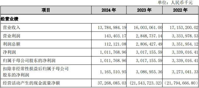 2024年,广州银行实现营业收入137.85亿元,同比减少13.86%;归属于母公司股东的净利润10.12亿元,同比减少66.47%;扣除非经常性损益后归属于母公司股东的净利润11.66亿元,同比减少62.24%;经营活动产生的现金流量净额为372.68亿元,上年同期为-215.44亿元。