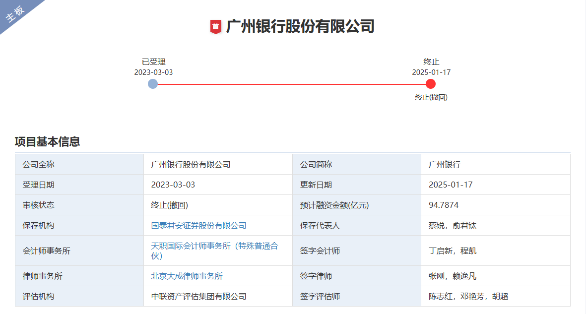 2025年1月17日,深交所网站公布关于终止对广州银行股份有限公司首次公开发行股票并在主板上市审核的决定。因广州银行及其保荐人撤回发行上市申请,根据《深圳证券交易所股票发行上市审核规则(2024年修订)》第六十二条,深交所决定终止其发行上市审核。
