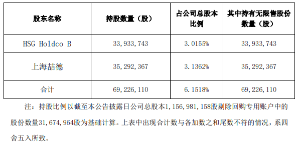 分别持有公司股份33,933,743股和35,292,367股(占公司总股本的比例分别为3.0155%和3.1362%)的股东HSG Holdco B和上海喆德,计划通过集中竞价交易或大宗交易等方式,合计减持公司股份不超过公司总股本的1.50%(即减持数量不超过16,879,592股)。