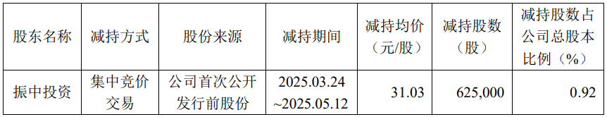 振中投资此次通过集中竞价交易方式减持公司首次公开发行前股份625,000股,减持期间为2025年3月24日至2025年5月12日,减持均价31.03元/股,占公司总股本的0.92%。根据上述数据计算,振中投资减持套现1939.375万元。