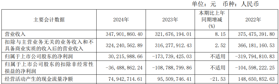 2024年,综艺股份实现营业收入3.48亿元,同比增长8.15%;归属于上市公司股东的净利润3021.60万元,上年同期为-1.74亿元;归属于上市公司股东的扣非净利润为-3648.89万元,2023年为-1.09亿元,2022年为-1.05亿元;经营活动产生的现金流量净额为7494.27万元,同比下降21.53%。