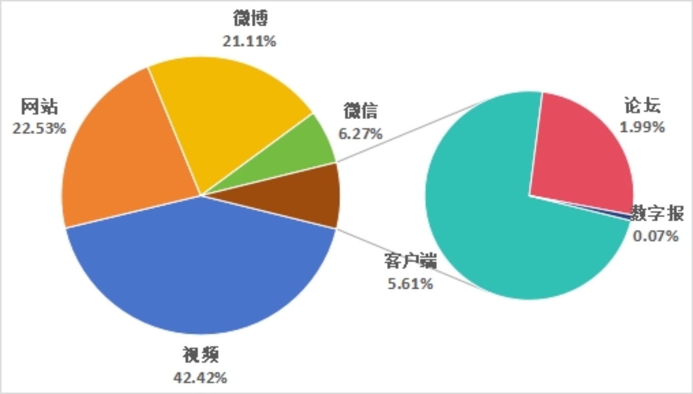 舆情分析显示,在6天的监测期内,共收集到“消费维权”相关信息20,889,961条,日均约348万条。舆情走势呈现平稳波动状态,5月6日信息量达到峰值,为4,079,752条。从信息传播渠道来看,视频以42.42%的占比位居首位,成为“消费维权”类信息传播的主要途径;网站和微博分别以22.53%和21.11%的占比紧随其后。