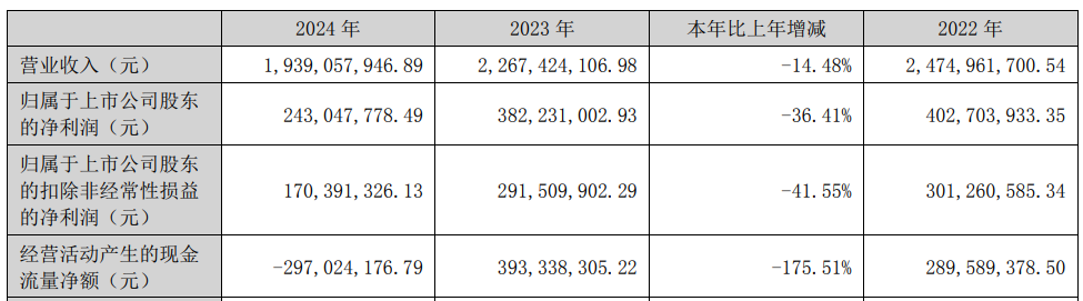 华策影视2024年实现营业收入为19.4亿元,同比下降14.48%;归属于上市公司股东的净利润为2.43亿元,同比下降36.41%;归属于上市公司股东的扣非净利润为1.70亿元,同比下降41.55%;经营现金流净额为-2.97亿元,上年同期为3.93亿元。