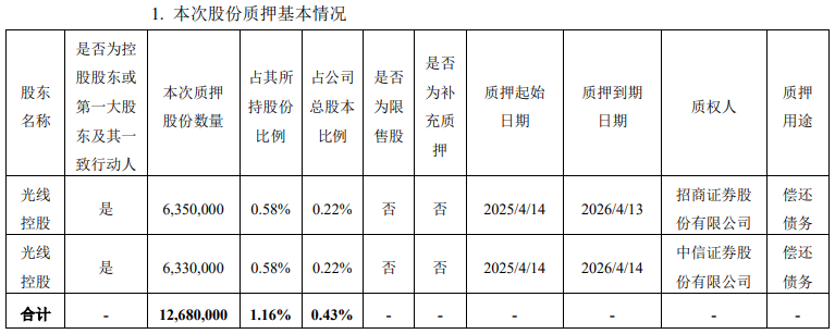 光线传媒于416日披露的关于控股股东部分股份质押及解除质押的公告显示,光线控股本次合计质押股份数量1268万股,占其所持股份比例1.16%,占公司总股本比例0.43%。质押用途为偿还债务。