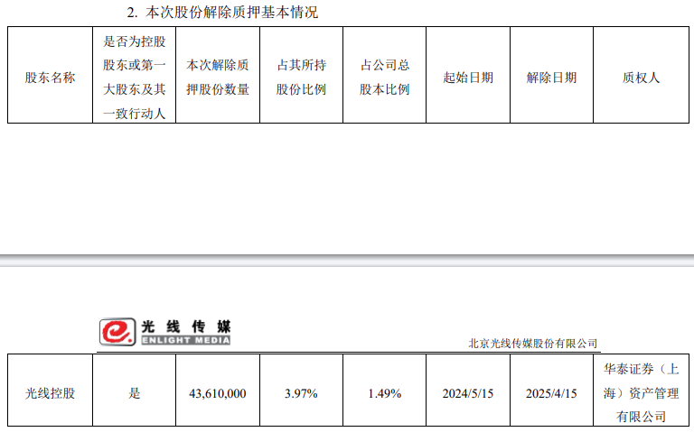 光线控股本次解除质押股份数量4361万股,占其所持股份比例3.97%,占公司总股本比例1.49%